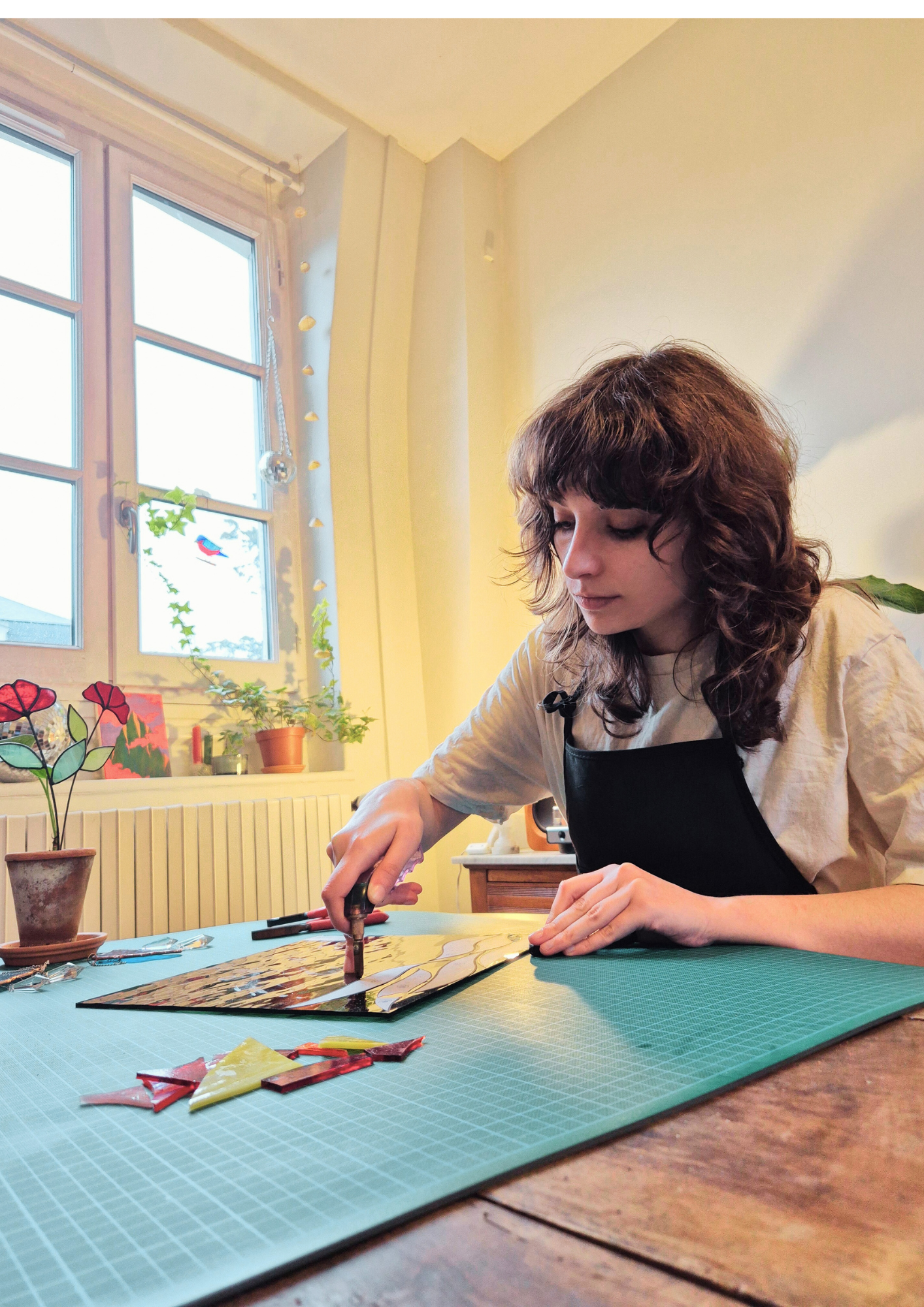 Son travail s’articule autour du dessin à l’encre de Chine, parfois réhaussé de couleurs à l’aquarelle ou à l’acrylique. Depuis 2024 elle se forme aussi au vitrail (technique Tiffany avec cuivre et étain).